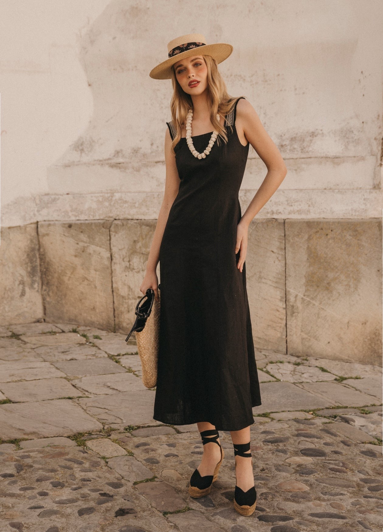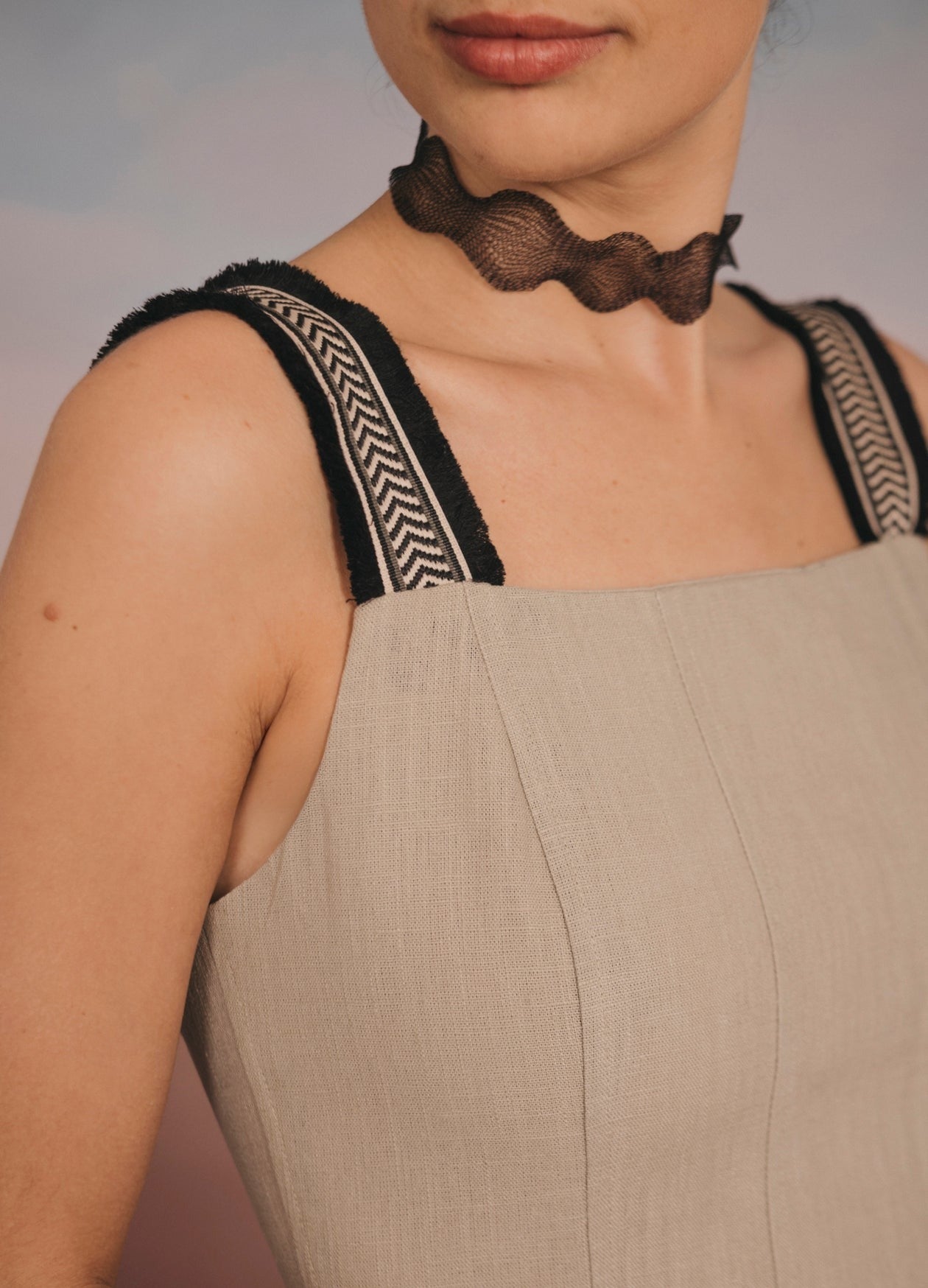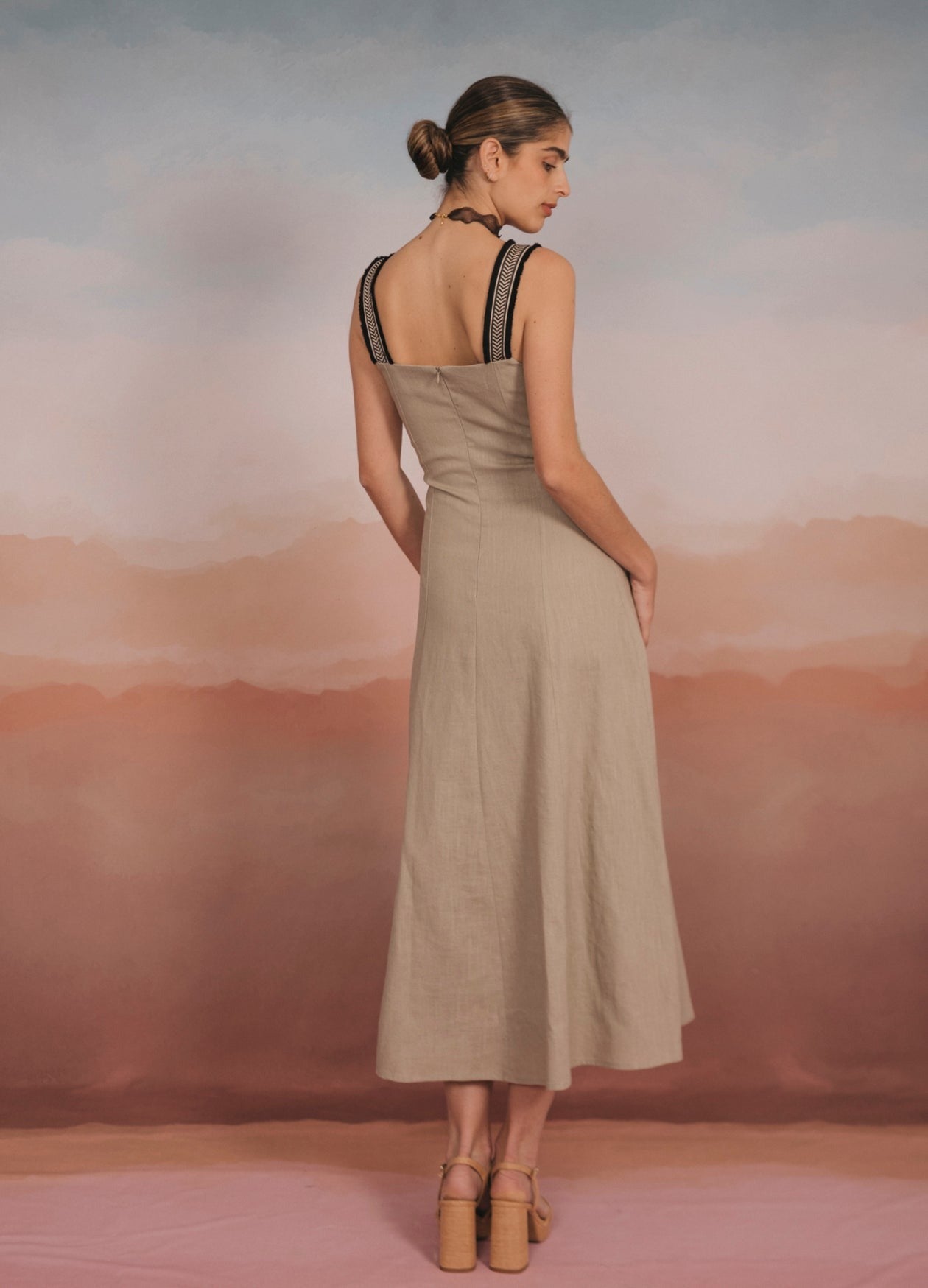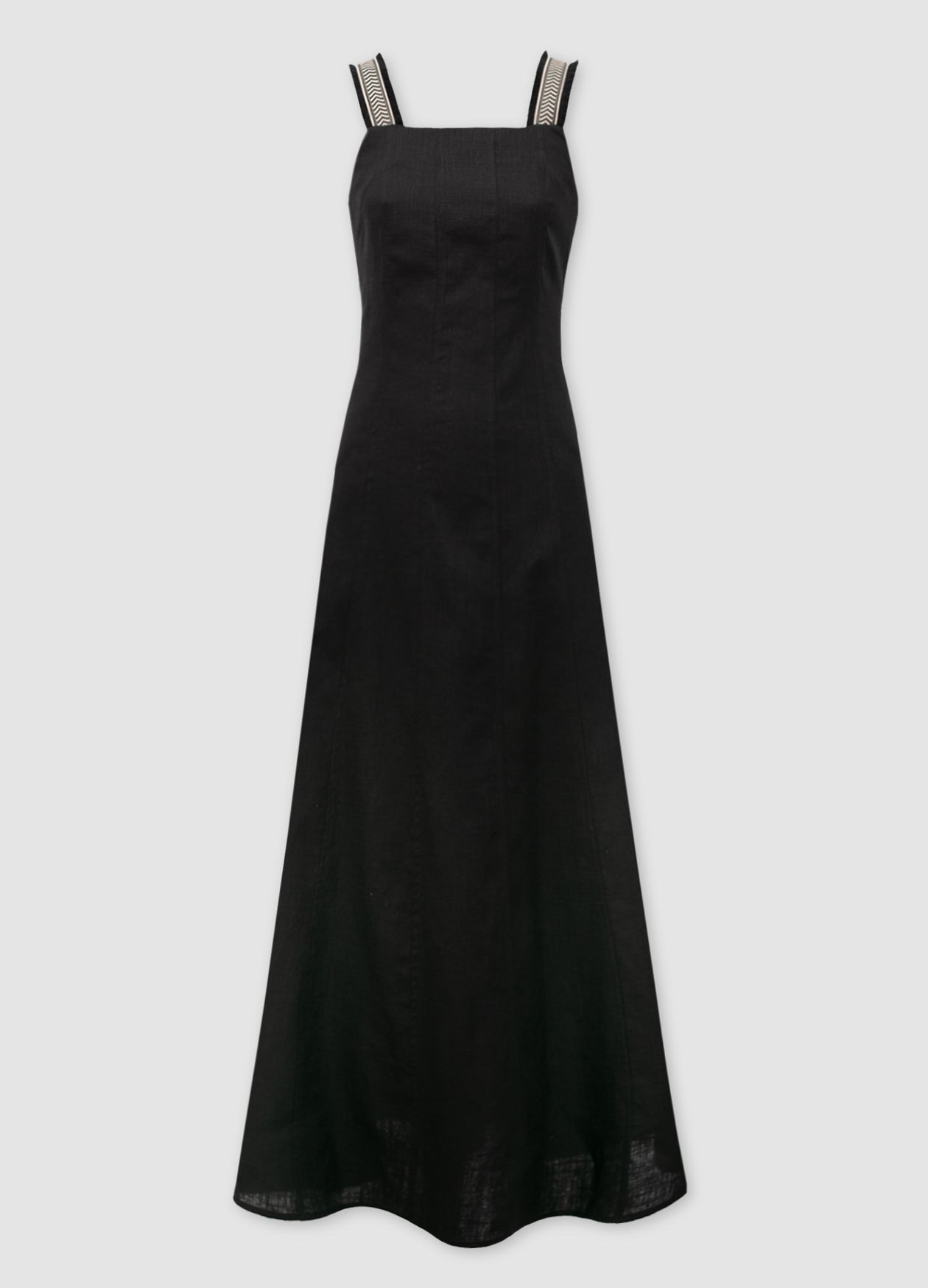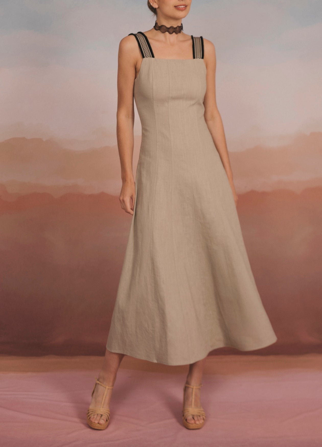 Vestido midi de tirantes con escote cuadrado y cortes verticales que terminan en falda evasé. Detalle de tirantes de algodón con dibujos de espiga y flecos en contraste. Abertura con cremallera invisible en la parte trasera.