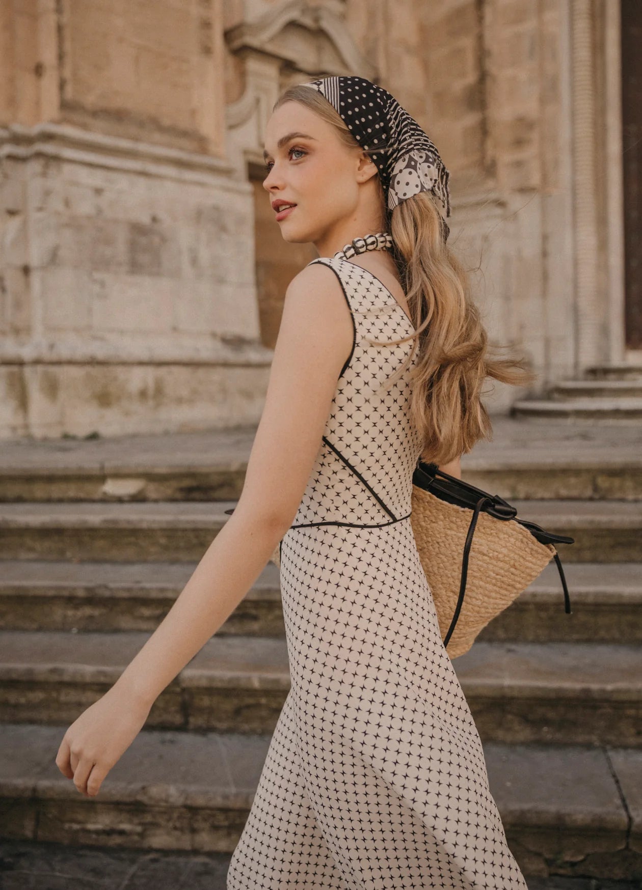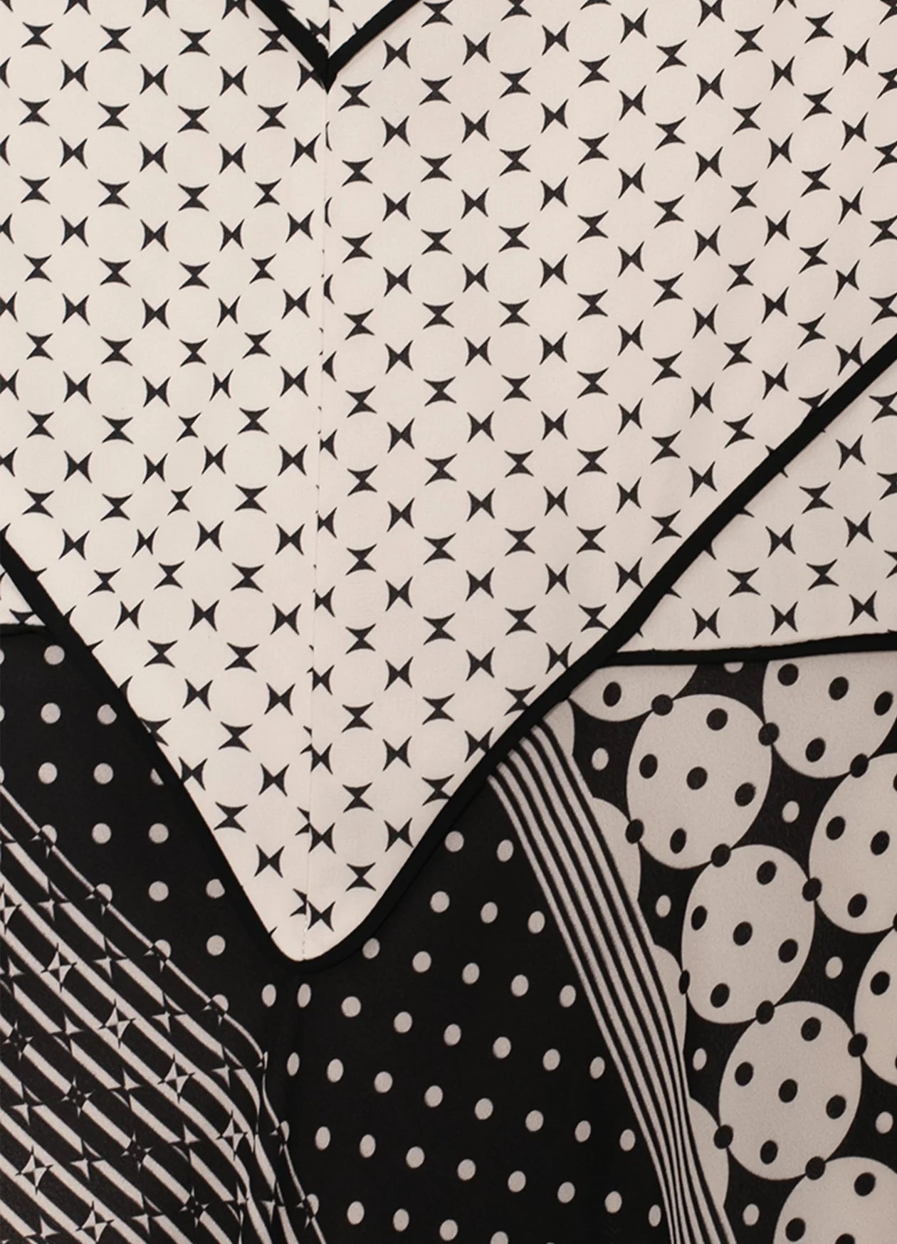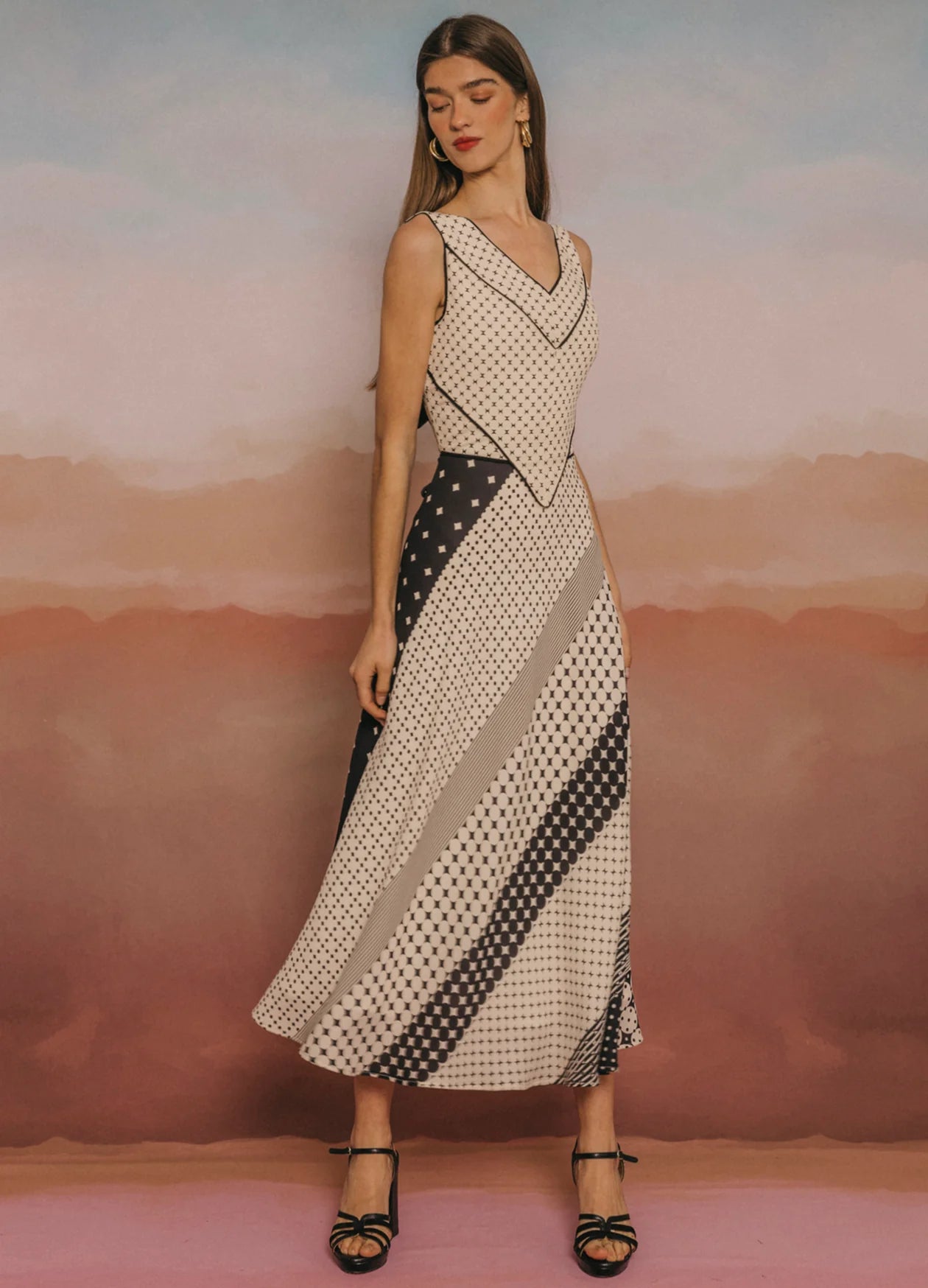 Vestido midi confeccionado en tejido estampado combinado. Presenta un escote pico en el delantero y la espalda, rematado con vivos hasta la cintura. La falda, de corte evasé, aporta volumen y estructura. Incorpora un cierre de cremallera invisible en la parte trasera y está completamente forrado.
