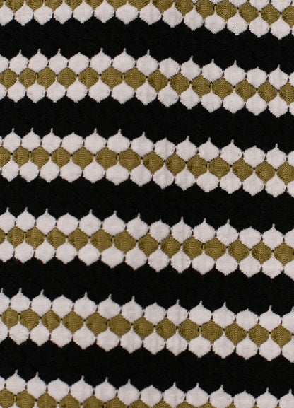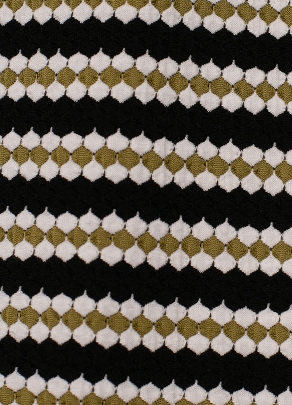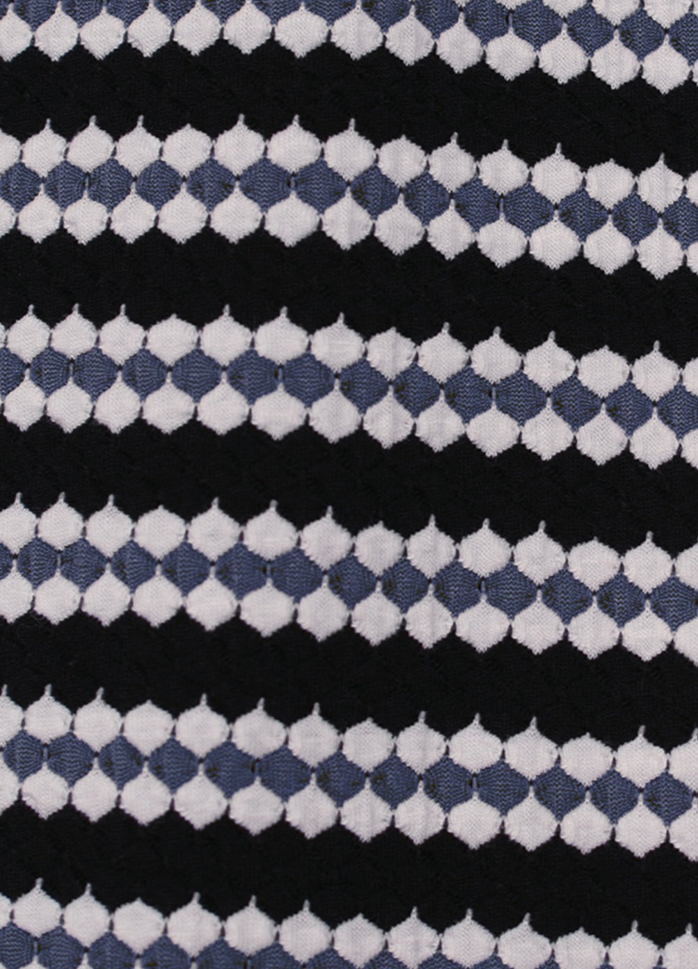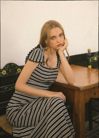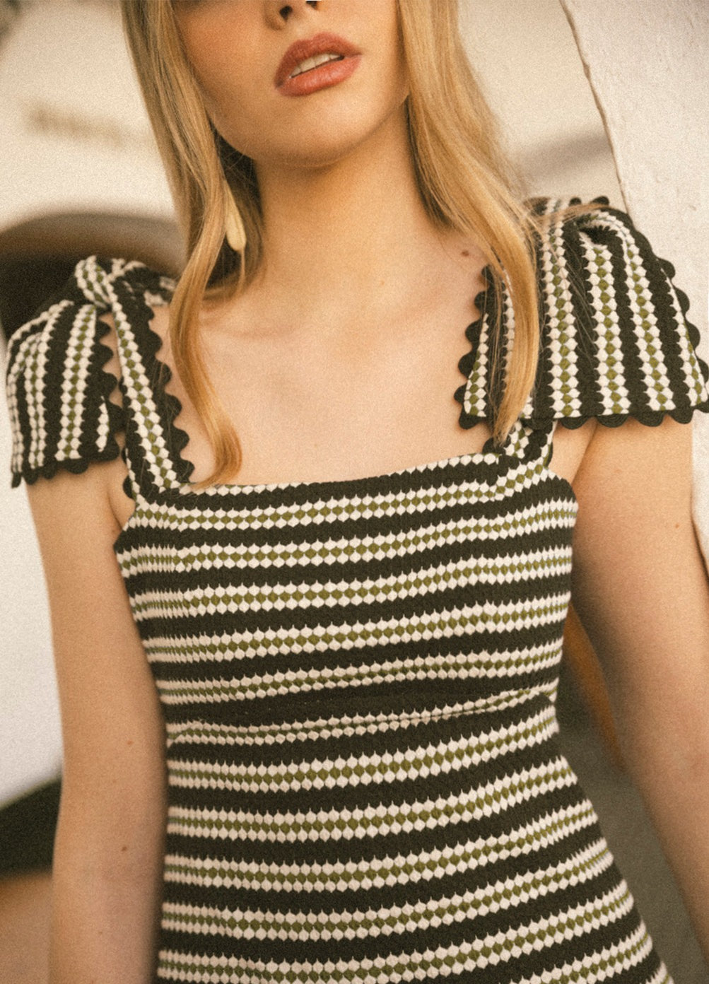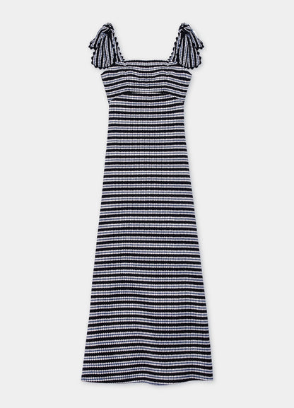 Vestido de corte midi, confeccionado en tejido jacquard de rayas. Diseño de tirantes anchos anudados, rematados con detalle de piquillo. Corte imperio con costura bajo el pecho y falda con vuelo. Cierre trasero con cremallera invisible.
