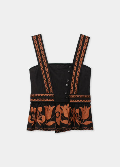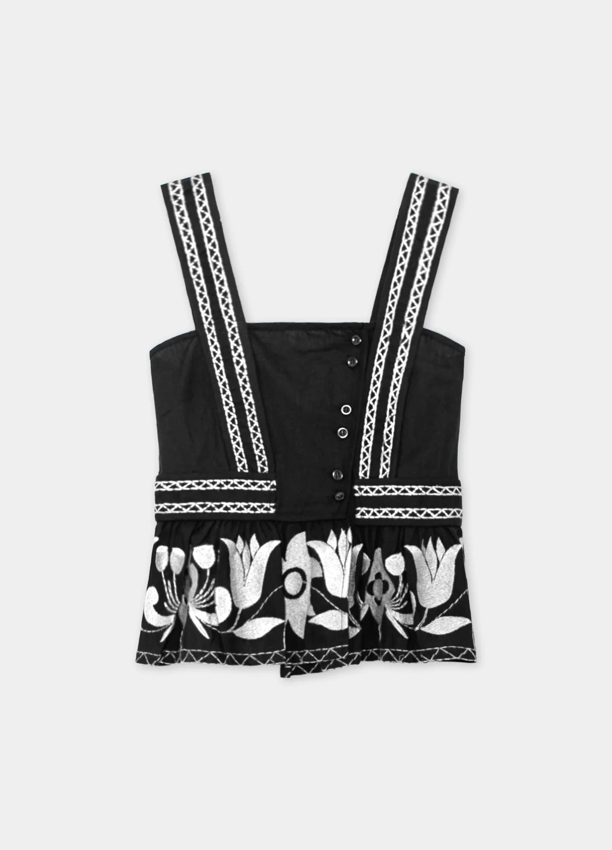 Tirantes geométricos bordados: Añaden contraste y detalle visual.