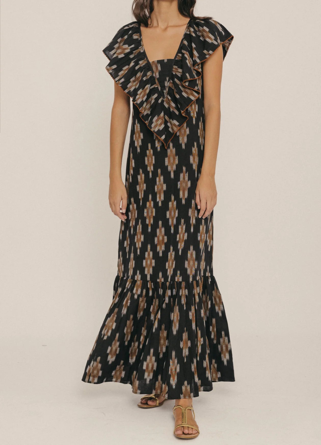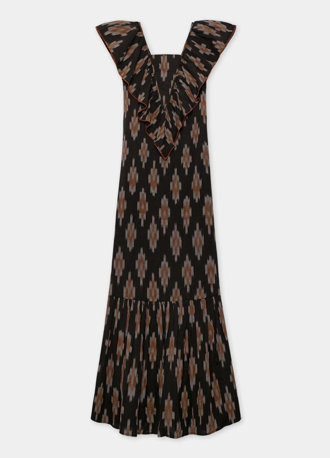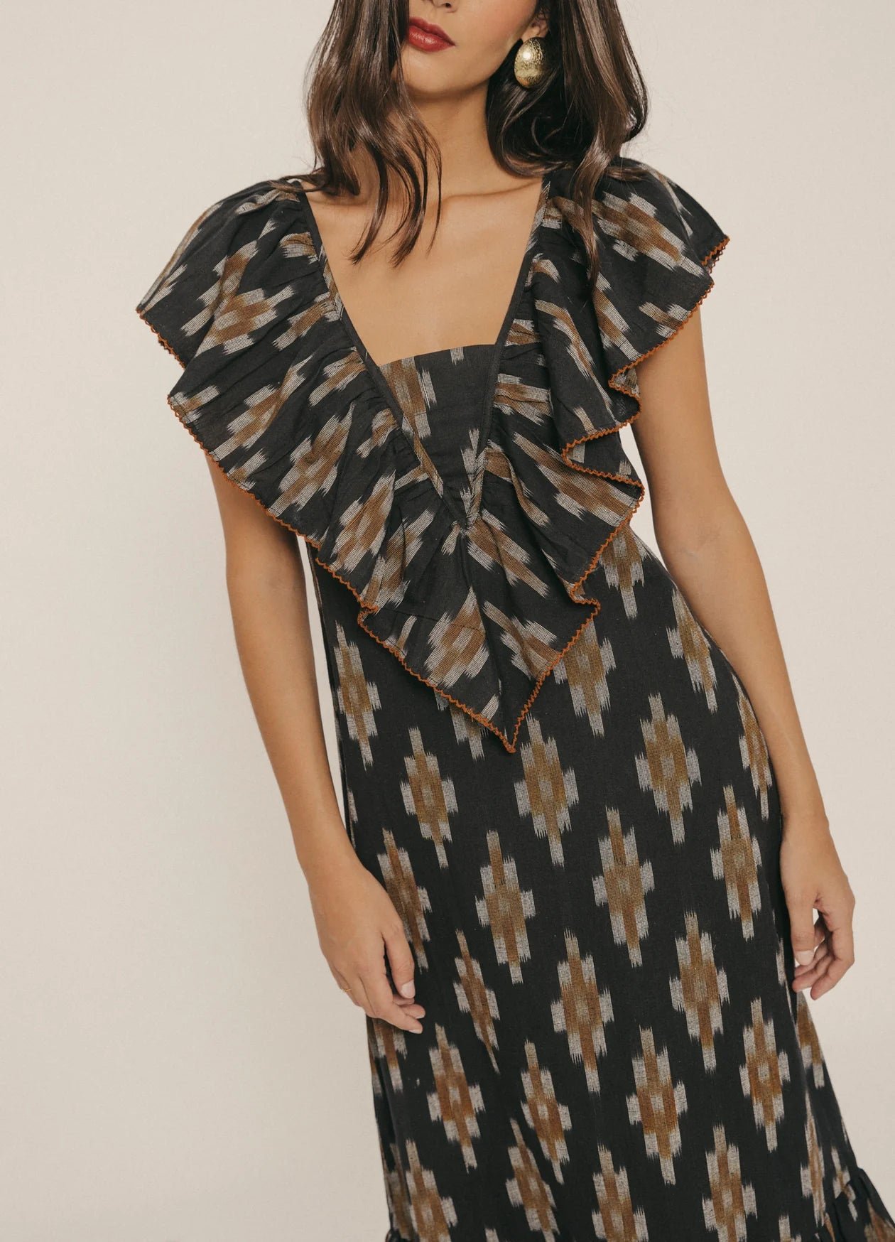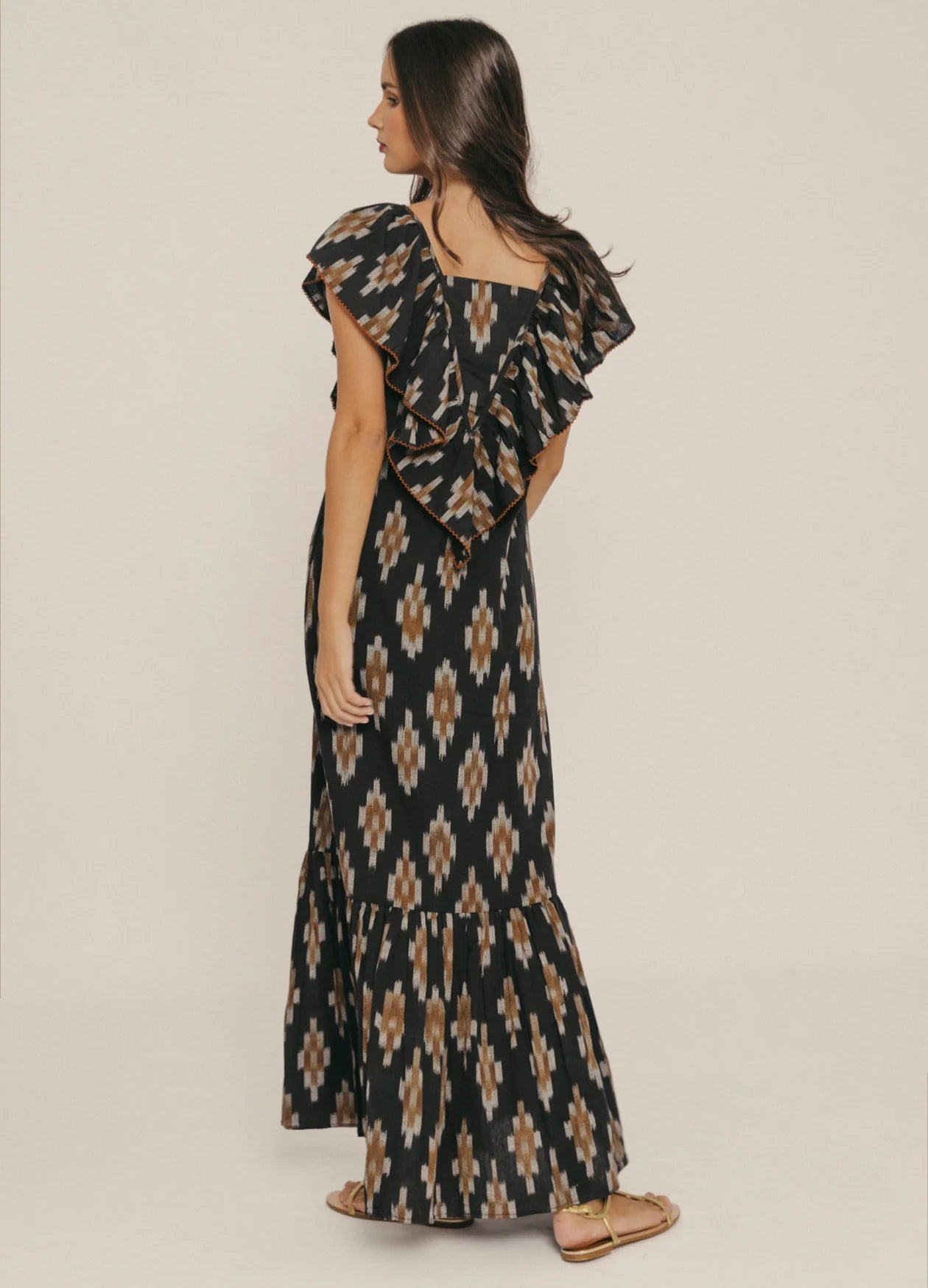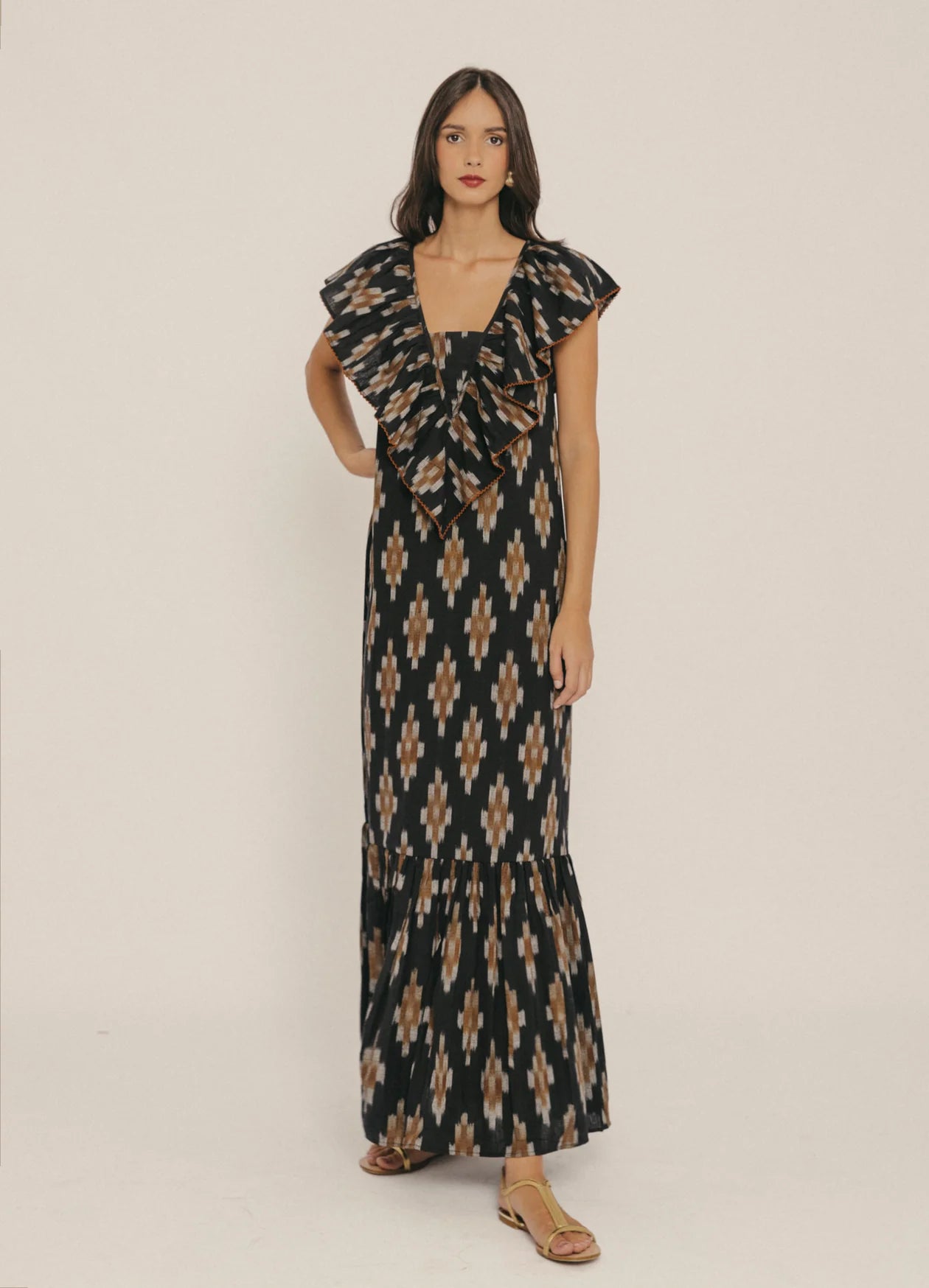 Nuestro popular vestido Mireya combina estampado con escote volante para un look lleno de personalidad. Su corte evasé y espalda en pico aportan frescura y movimiento, ideal para cualquier ocasión especial.